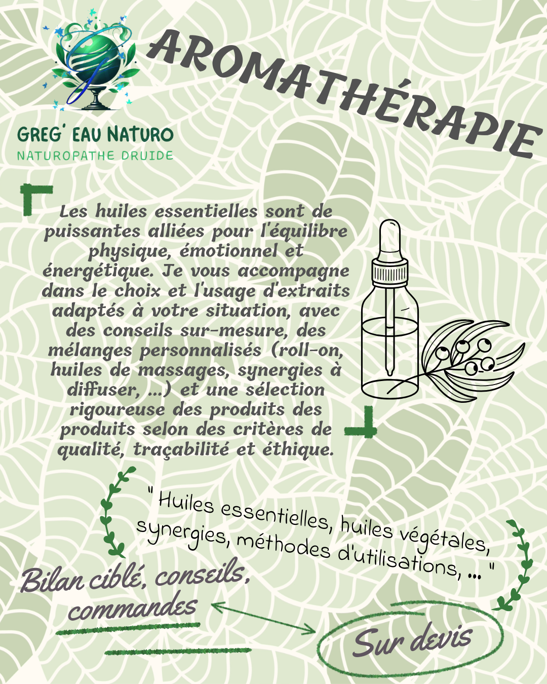 « Les huiles essentielles sont de puissants alliés pour l’équilibre physique, émotionnel et énergétique. Je vous accompagne dans le choix et l’usage d’extraits adaptés à votre situation, avec des conseils sur-mesure, des mélanges personnalisés (roll-on, huiles de massage, synergies à diffuser, …) et une sélection rigoureuse des produits selon des critères de qualité, traçabilité et éthique. »