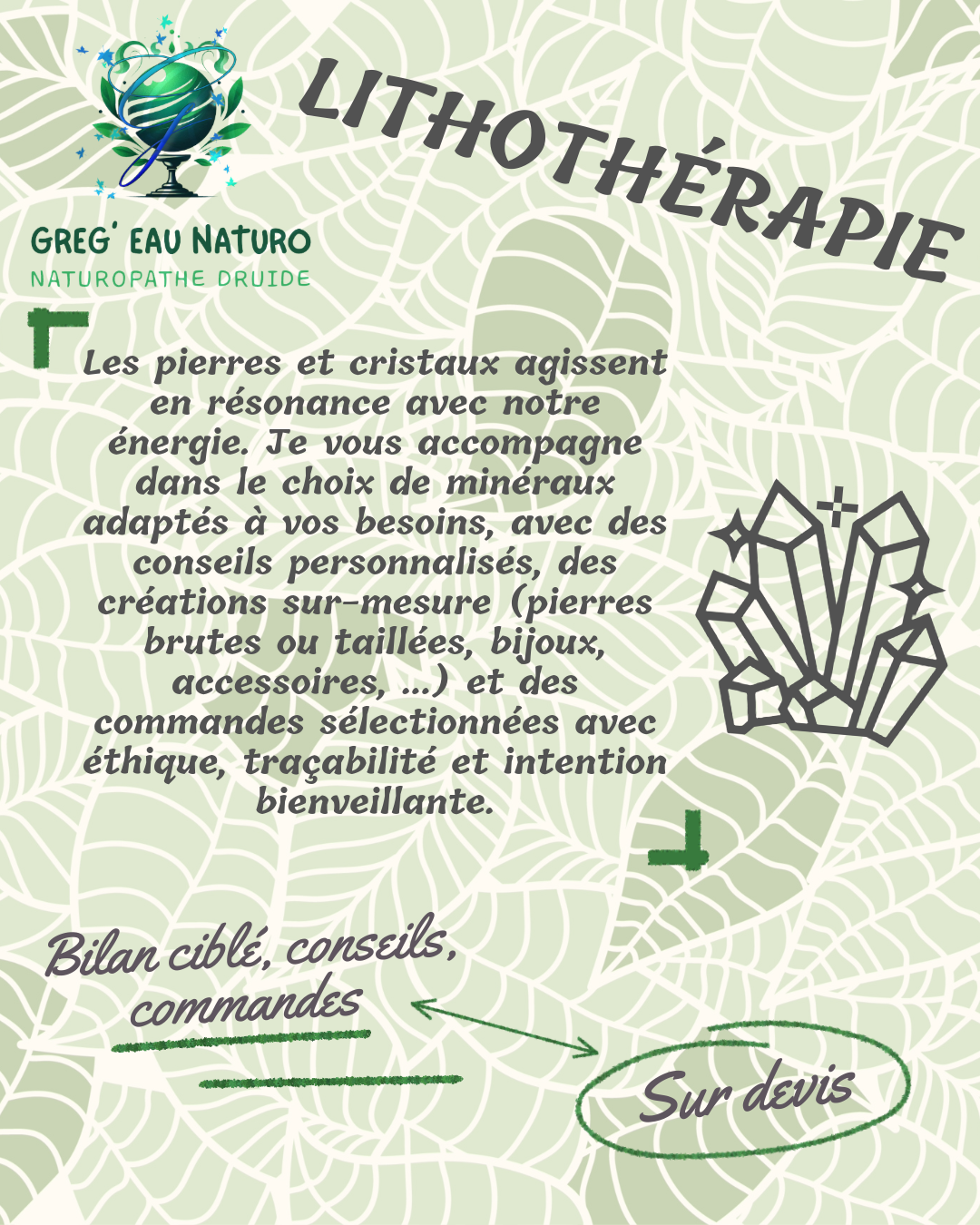 Prix: sur devis Contacter Greg'Eau Naturo« Les pierres et cristaux agissent en résonnance avec notre énergie. Je vous accompagne dans le choix de minéraux adaptés à vos besoins, avec des conseils personnalisés, des créations sur-mesure (pierres brutes ou taillées, bijoux, accessoires, …) et des commandes sélectionnées avec éthique, traçabilité et intention bienveillante. »