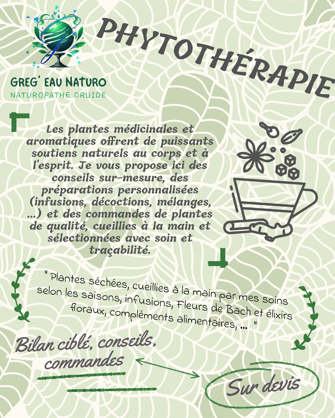 « Les plantes médicinales et aromatiques offrent de puissants soutiens naturels au corps et à l’esprit. Je vous propose ici des conseils sur-mesure, des préparations personnalisés (infusions, décoctions, mélanges, …) et des commandes de plantes de qualité, cueillies à la main et sélectionnées avec soin et traçabilité. »