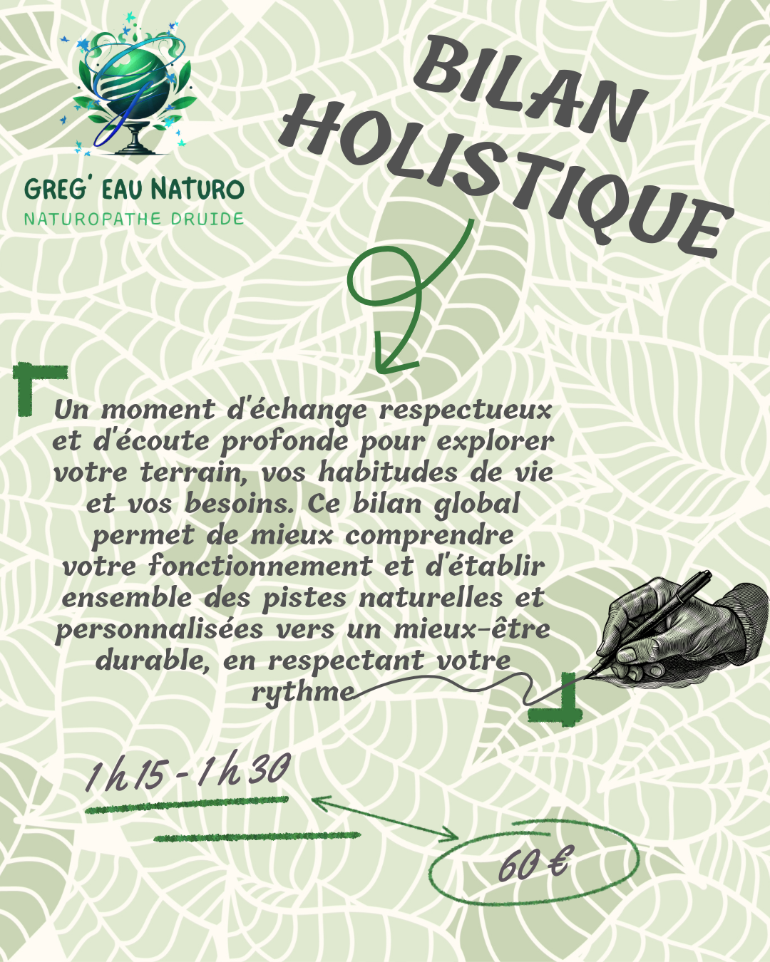 « Un moment d’écoute profonde pour explorer votre terrain, vos habitudes de vie, vos émotions et vos besoins. Ce bilan global permet de mieux comprendre votre fonctionnement et d’établir ensemble des pistes naturelles et personnalisées vers un mieux-être durable, en respectant votre rythme. »
