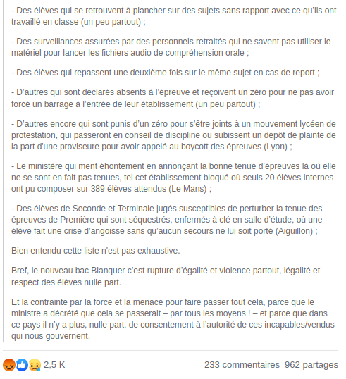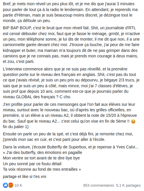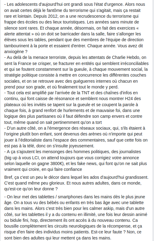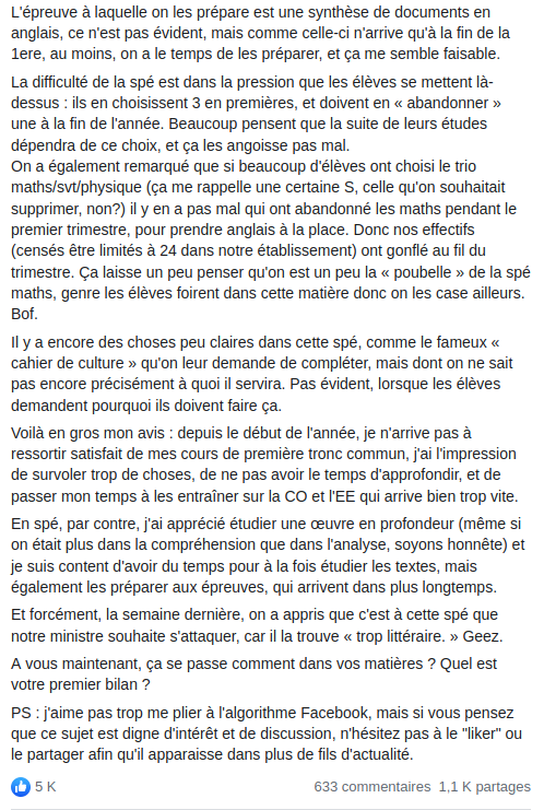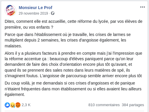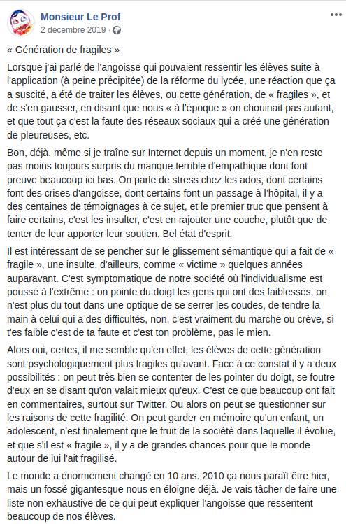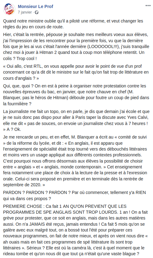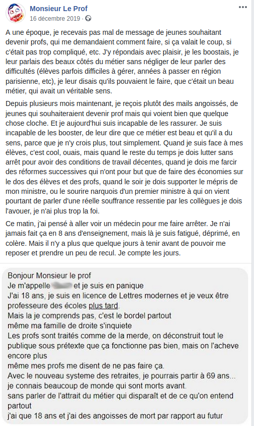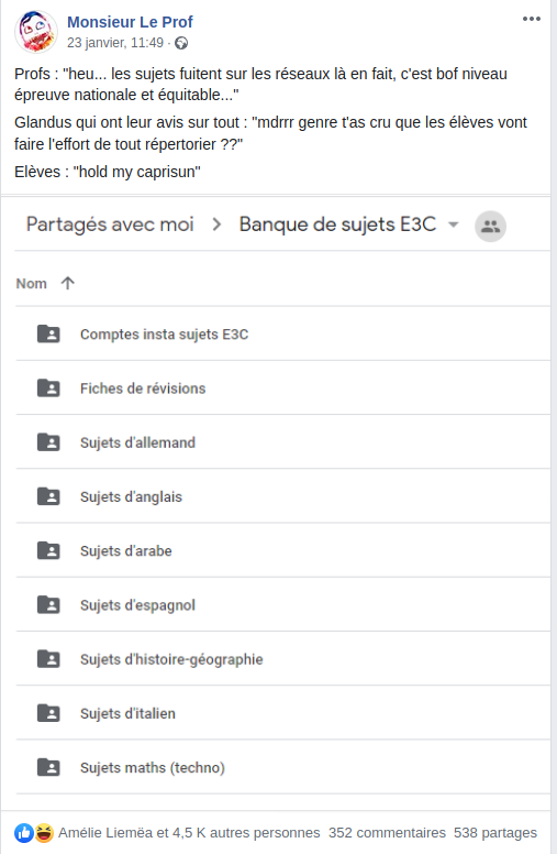 Dans cet article, je vais vous partager les posts Facebook d’un professeur bien connu des réseaux sociaux. J’ai voulu utiliser sa prise de parole, qui est beaucoup plus calée et expérimentée afin de vous montrer ce qu’il en est. Cet homme s’appelle Monsieur Le Prof et vous pouvez retrouver son Facebook ici: https://www.facebook.com/bongeourre/. Il est également sur Twitter pour ceux qui veulent.