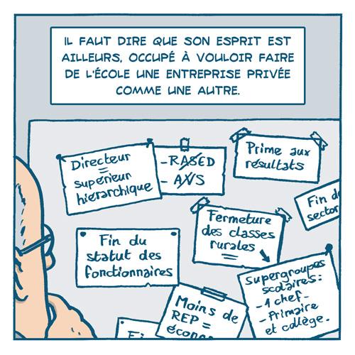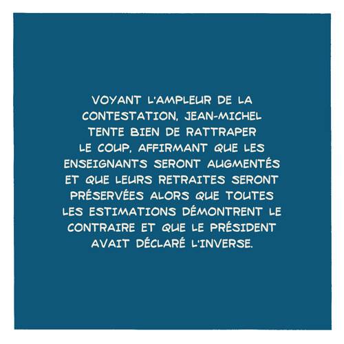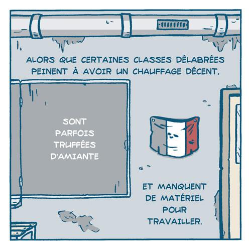 Mais bon, la stratégie du gouvernement fonctionne, puisque de plus en plus de professeurs sont fatigués et dégoûtés du métier. Ils démissionnent ou se suicident. Ça évite les licenciements me direz-vous. Même Monsieur Le Prof, que je suis depuis quelques années, commence à déchanter. Je l’ai vu changer: toujours un discours positif, à parler du métier, à donner envie aux étudiants de faire cette profession. Mais aujourd’hui…