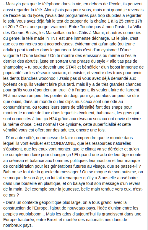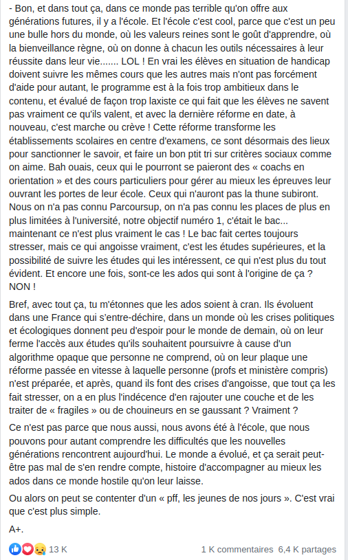 Que dire ? En fait, je crois que tout est dit. N’hésitez pas à débattre en commentaires. En bonus, je vais vous donner deux autres documents: un sur l’état psychologique des adolescents de nos jours, et un qui est constitué de témoignages.