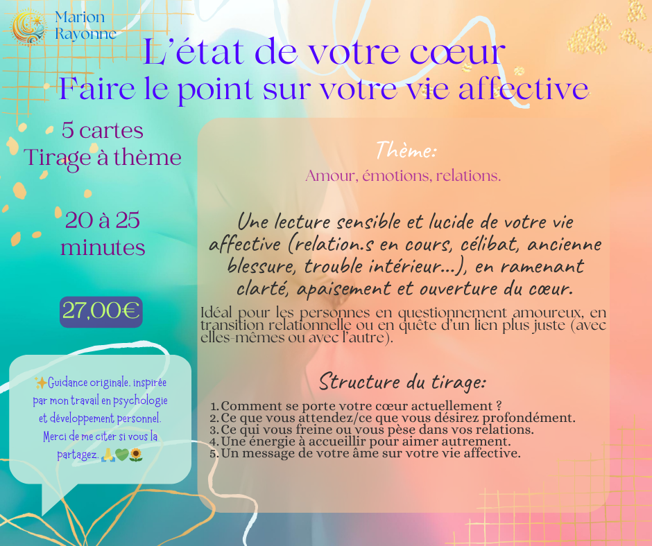 Consultez la liste de toutes mes tirages de cartomancie: www.la-soigneuse-et-le-druide.fr/prestations/marion-rayonne/cartomancie