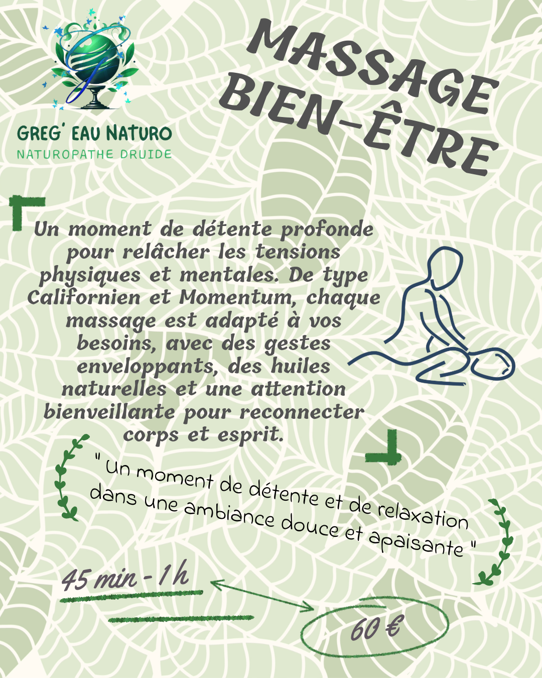 Un pur moment de détente de 45min-1h pour 60€ qui vous permet de vous évader et de vous laisser aller le temps d’un instant. Je vous propose ici un massage bien-être de type Californien et Momentum qui sera adapté à vos besoins ou ne serait-ce à vos envies de détente. Mes outils ? Une table de massage pliante confortable, des serviettes 100% coton douces pour vous apporter un meilleur confort et une intimité respectée, des huiles de massages à base d’huiles essentielles bio prédéfinies ou des mélanges créés sur mesure selon vos goûts, une musique d’ambiance douce et relaxante, des encens ou une diffusion d’huile essentielle pour une sensation olfactive unique, et bien entendu mon savoir-faire et mes mains qui sauront vous apporter des gestes doux, enveloppants et respectueux de votre peau et de votre sensibilité.