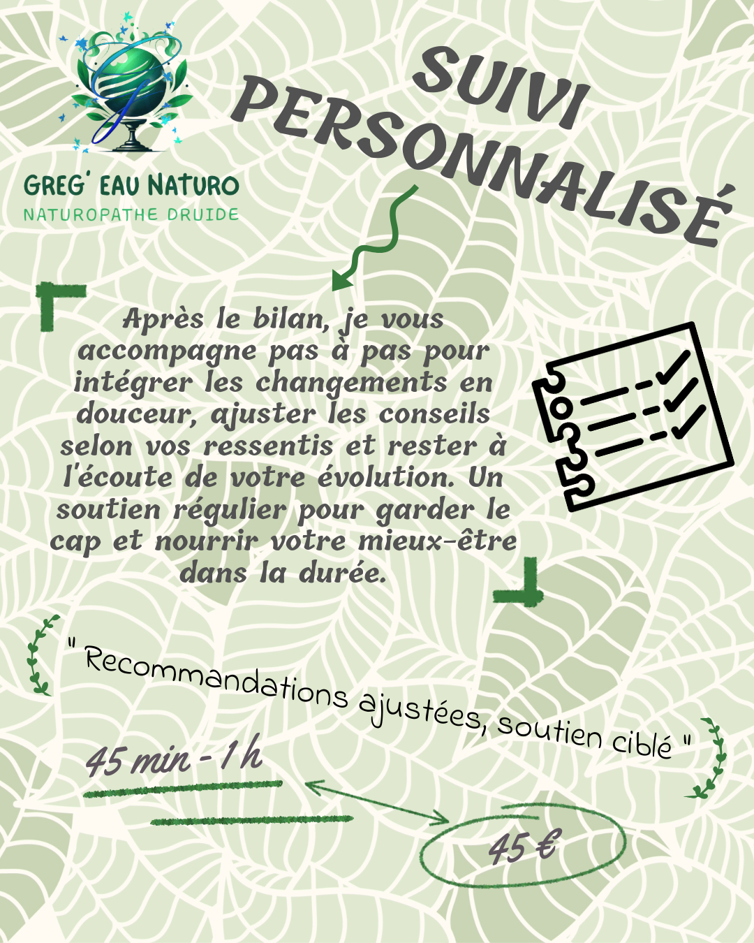 « Après le bilan, je vous accompagne pas à pas pour intégrer les changements en douceur, ajuster les conseils selon vos ressentis et rester à l’écoute de votre évolution. Un soutien régulier pour garder le cap et nourrir votre mieux-être dans la durée. »